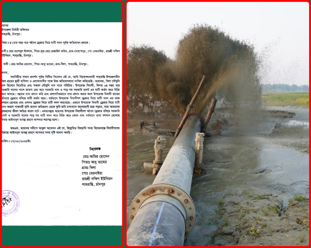 শাহরাস্তিতে অবৈধ ড্রেজার দৌরাত্ম্য,ফসলি জমি ও সরকারি খাল ধ্বংসে প্রশাসনের নীরবতা